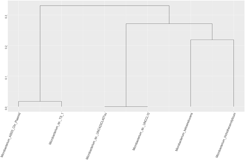- Dendogram of Microbacterium sp. AISO3 and the five closest neighboring genomes.