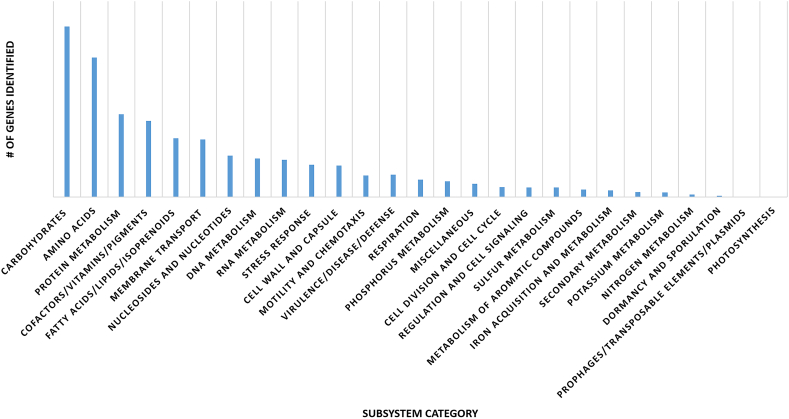 - Subsystem category distribution of major protein coding genes of Microbacterium sp. strain AISO3 as annotated by the RAST annotation server.